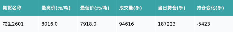 南财智讯10月17日电股融通,南财金融终端盘后期货数据显示,郑州商品交易所的花生主力合约收跌0.88%,收盘报7928.0元/吨,日内资金流出3521.99万元。其他相关指标见下表: