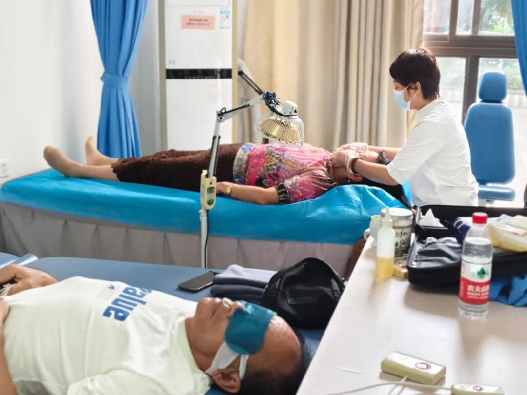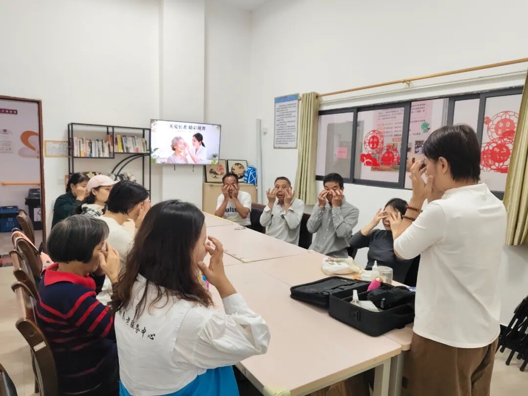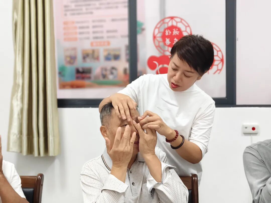 在“眼部护理体验”环节中,志愿者为有需要的长者提供眼部放松服务。志愿者同时讲解护眼要点,叮嘱“外出戴遮阳帽防紫外线”“看书看报要保证光线充足”等日常细节。针对老年人身体特点,志愿者们教授如何通过正确按压睛明穴、太阳穴,以及远近视线交替等方法来缓解眼疲劳,并手把手带领长者练习眼保健操。